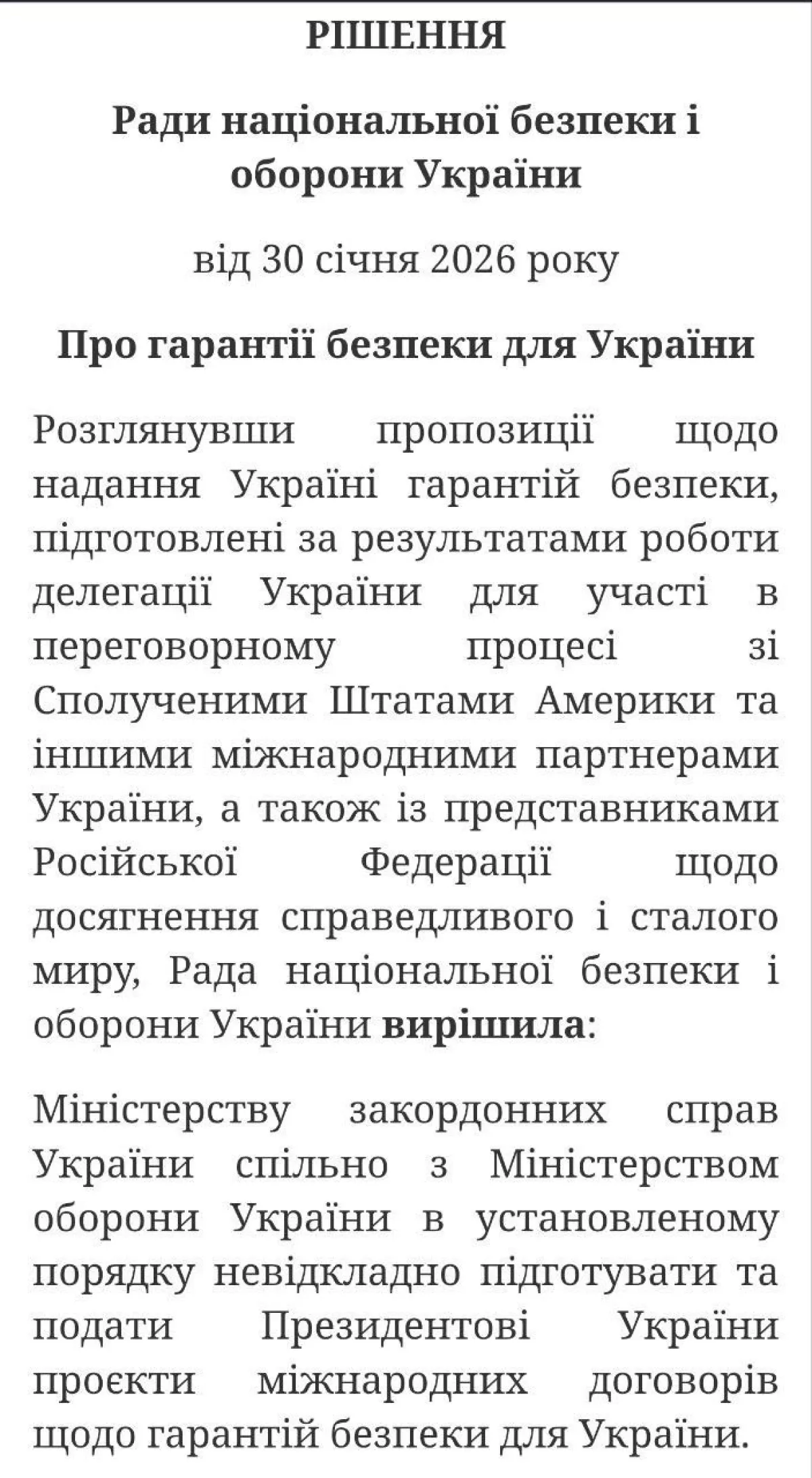 Президент Украины Владимир Зеленский опубликовал на своём сайте указ о подготовке международных договоров, касающихся гарантий безопасности для страны. Документ вводит в действие решение Совета национальной безопасности и обороны (СНБО) от 30 января 2026 года «О гарантиях безопасности для Украины». Контроль за выполнением возложен на секретаря СНБО Рустема Умерова, указ вступает в силу со дня публикации.