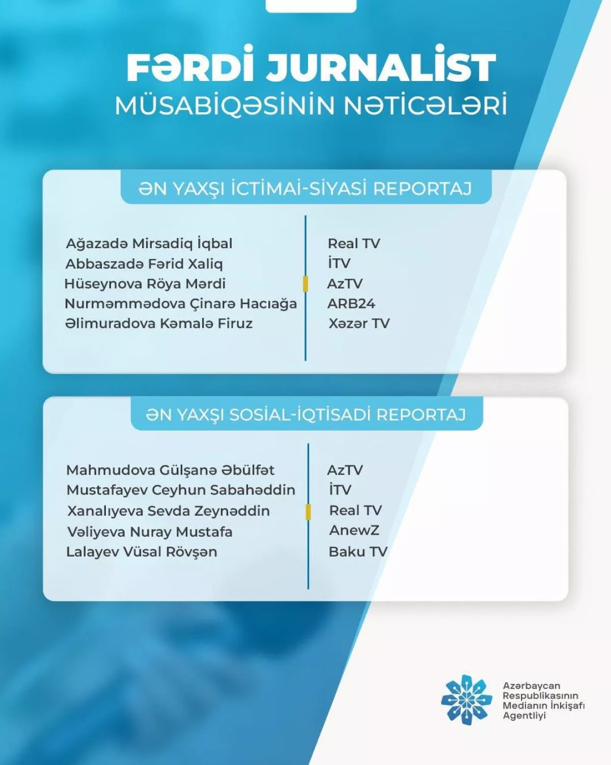Среди победителей конкурса также корреспондент Oxu.az Азиза Исмаилова («Лучшее журналистское расследование»), журналист газеты Kaspi Азад Алиев («Лучший общественно-политический анализ») и корреспондент Baku TV Вюсал Лалаев («Лучший социально-экономический репортаж»).