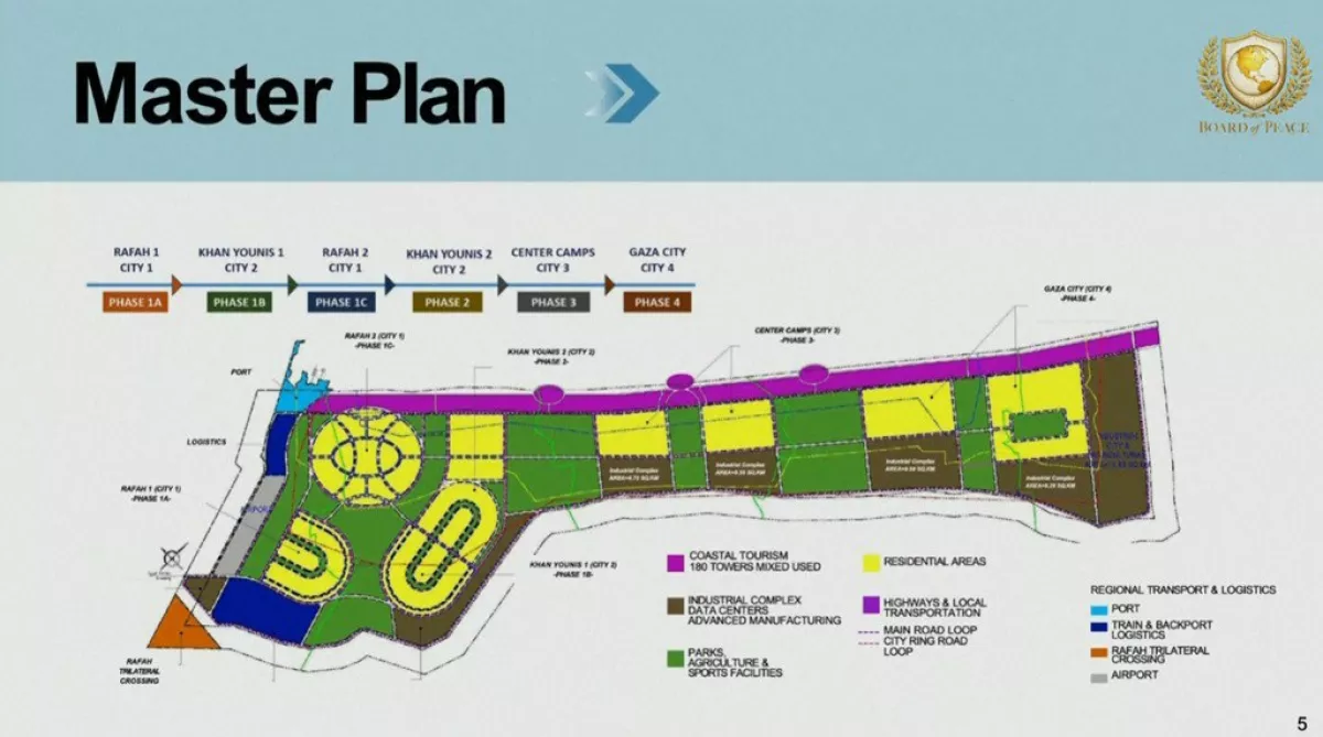 «Этот район будет разделён на зоны. Вначале мы рассматривали идею начать со свободной зоны, наряду с зоной, контролируемой ХАМАС. Но потом мы сказали: почему бы не планировать подлинный успех?» — подчеркнул Кушнер, добавив, что существует генеральный план. Проект будет реализовываться поэтапно и охватит как Газу, так и другие части Ближнего Востока.